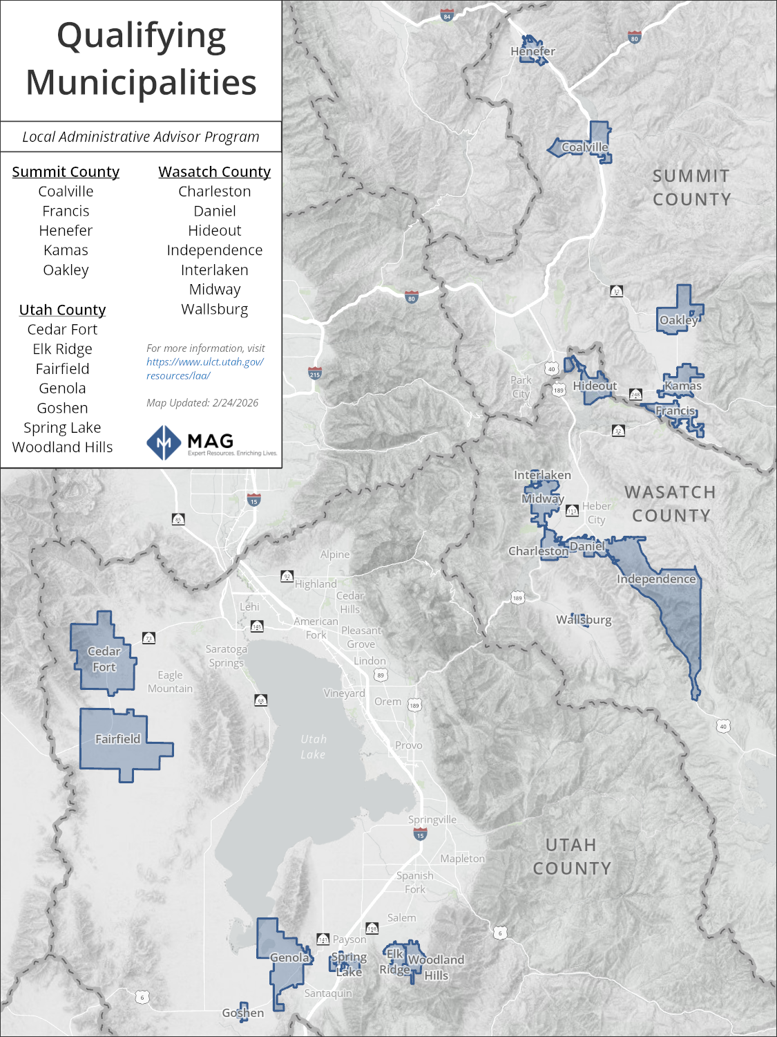 In the MAG region, one full-time LAA Program Manager provides technical assistance to 19 eligible cities and towns located in Summit, Utah, and Wasatch counties.